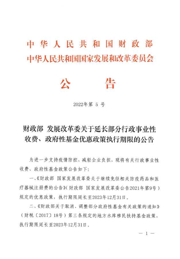 财政部 发展改革委关于延长部分行政事业性收费、政府性基金优惠政策执行期限的公告