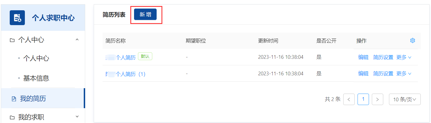 五、点击“个人中心”,可进入查看个人信息、申请职位信息、点击“编辑”可进入个人信息编辑界面;点击“我的简历”可设置个人简历