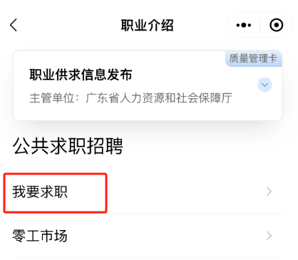 (二)选择“就业”模块,进入“就业服务”后选择“职业介绍”进入“公共求职招聘”模块,点击“我要求职”;