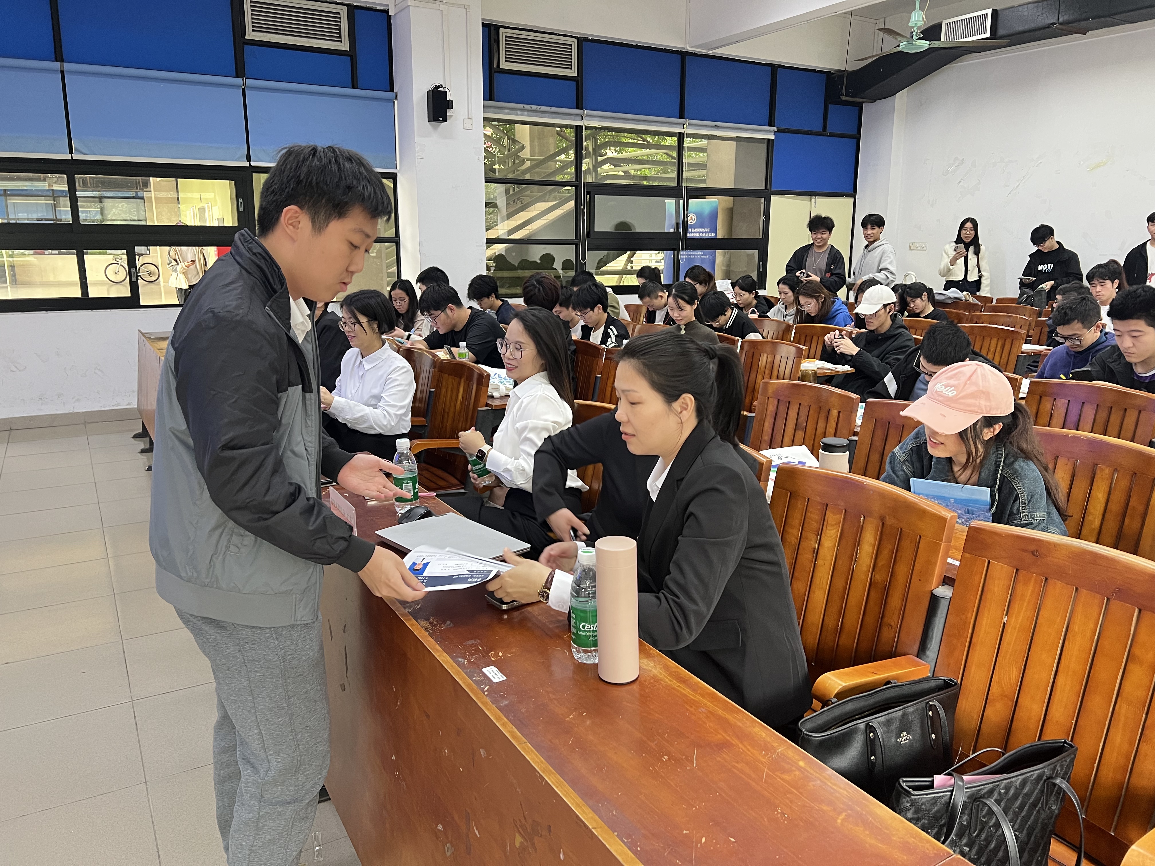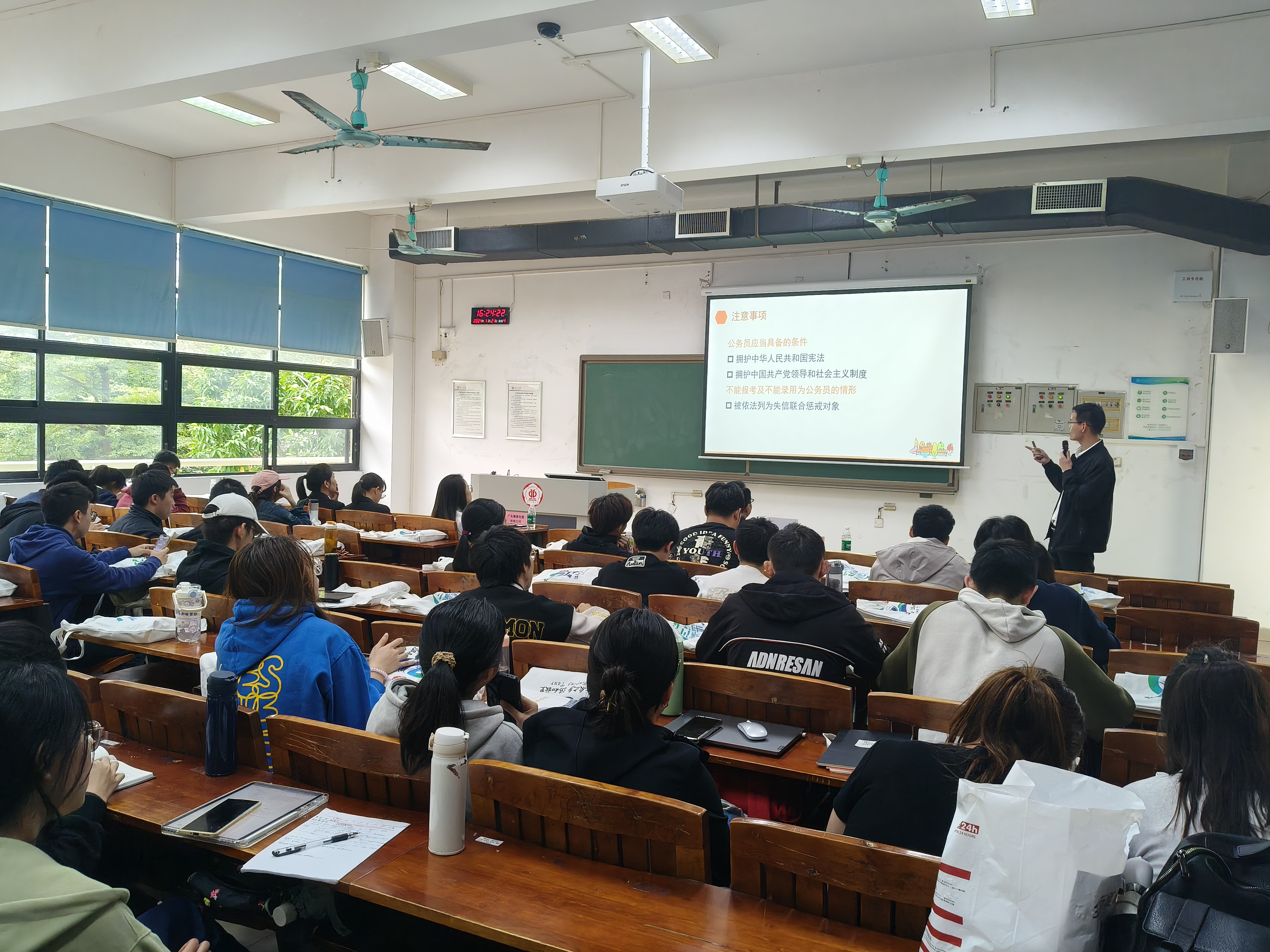 恩平企业介绍完成后,由快猫 委组织部副部长刘雄彬为在场学生宣讲公务员考试政策,围绕公务员招录条件、政策以及公务员需具备的综合素养展开宣讲,为在场学生提供了宝贵的知识与借鉴。