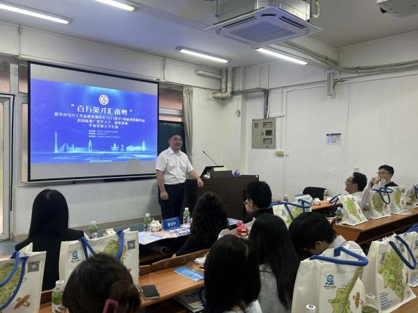 人力资源和社会保障局副局长纪圣军向校方和学生介绍了恩平的城市发展、产业布局、人才需求情况以及相关人才政策,展示了快猫