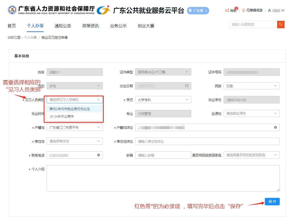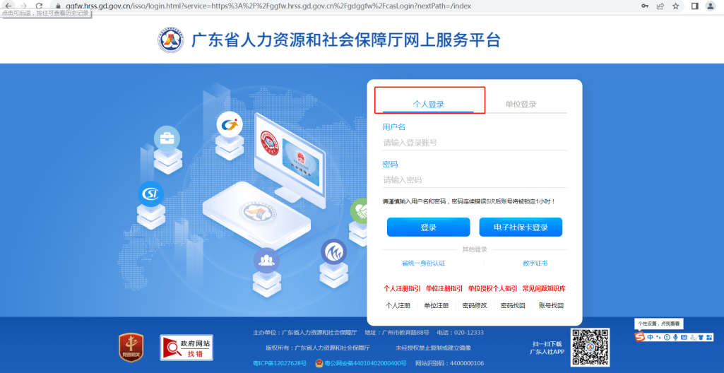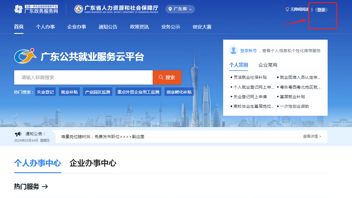//ggfw.hrss.gd.gov.cn/employment/internet/portal/#/home,求职人员点击“个人登录”