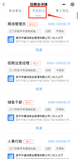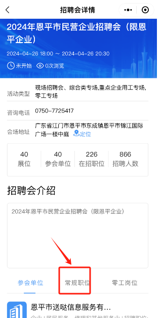 (四)点击招聘会名称,即可查看招聘详细信息,选择“常规职位”可查阅招聘会招聘岗位信息并投递简历。