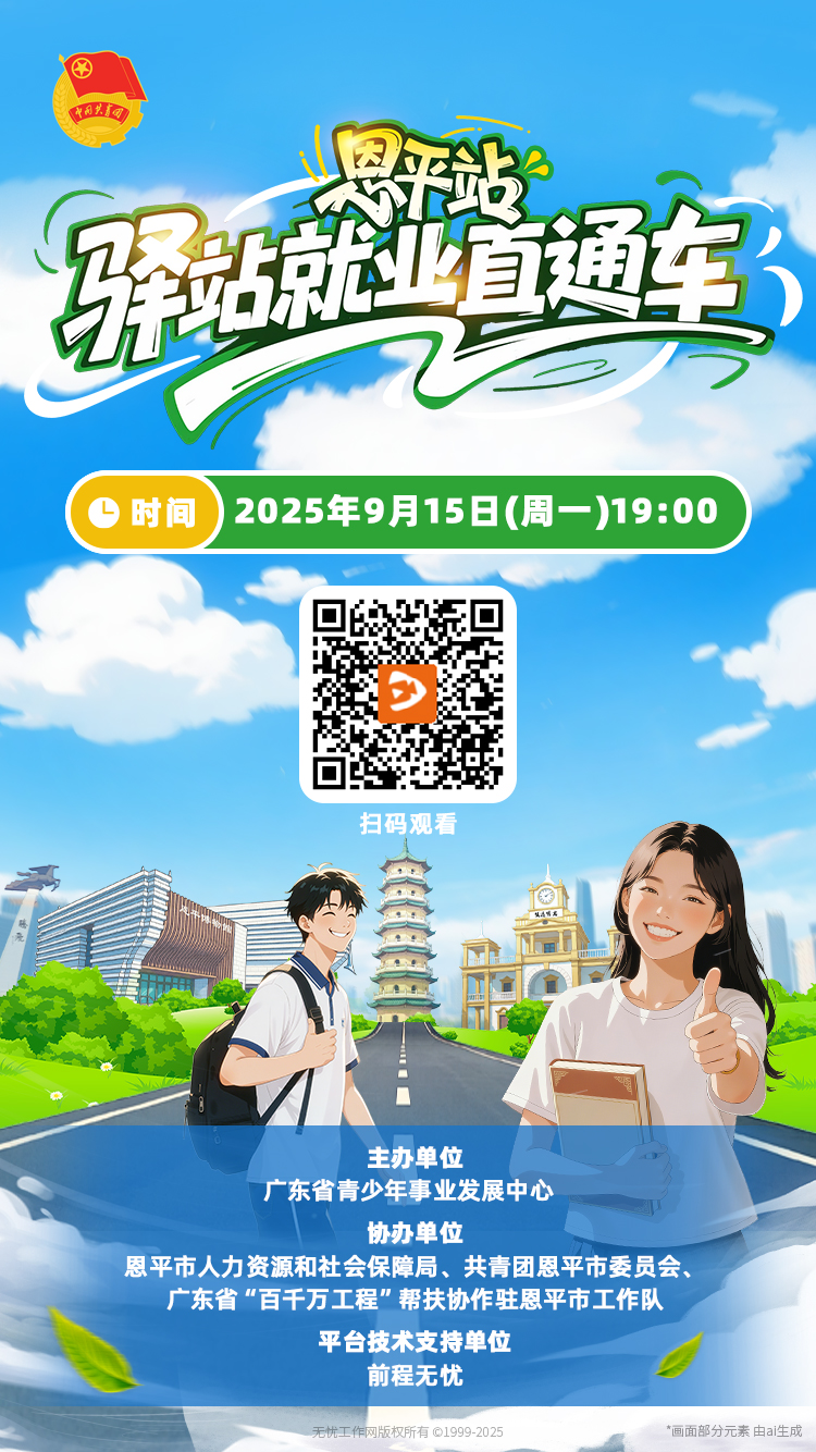 由广东共青团联合快猫 人力资源和社会保障局、共青团快猫 委员会、广东省“百千万工程”帮扶协作驻快猫 工作队举办的“驿站就业直通车“恩平专场活动即将开启!