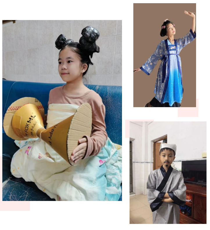 在老师、家长的引导下,小学生们“推”开历史尘封的大门,乘上旅行“时光机”,“云游”中华上下五千年。他们饶有趣味地搜索着文物的历史背景,乐此不疲地了解文物的历史故事,仔细观察文物外形,以及上面的人物着装、动作和面部表情,发挥奇思妙想,对文物进行模仿和演绎。