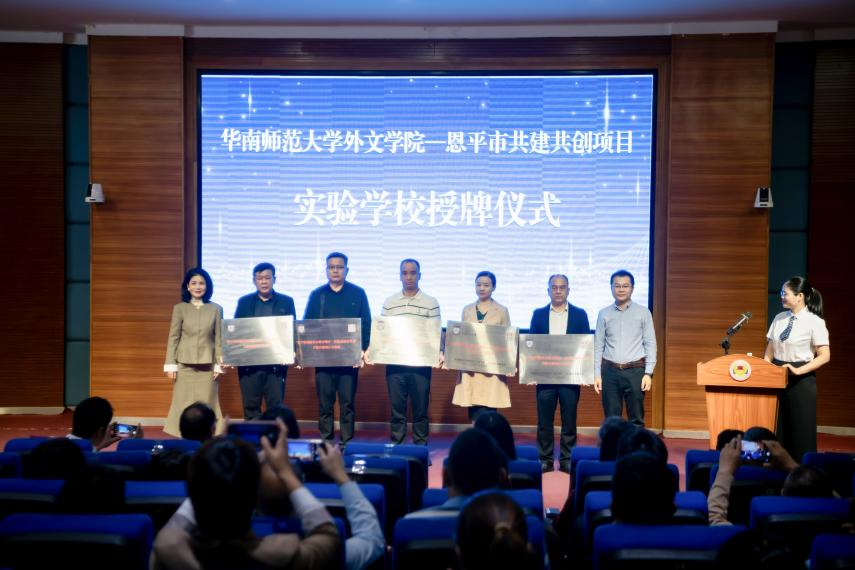 仪式上,华南师范大学外文学院向快猫 第一中学、恩平黄冈实验中学等16所实验学校捐赠了数字化教学系统与资源,并分批授牌。