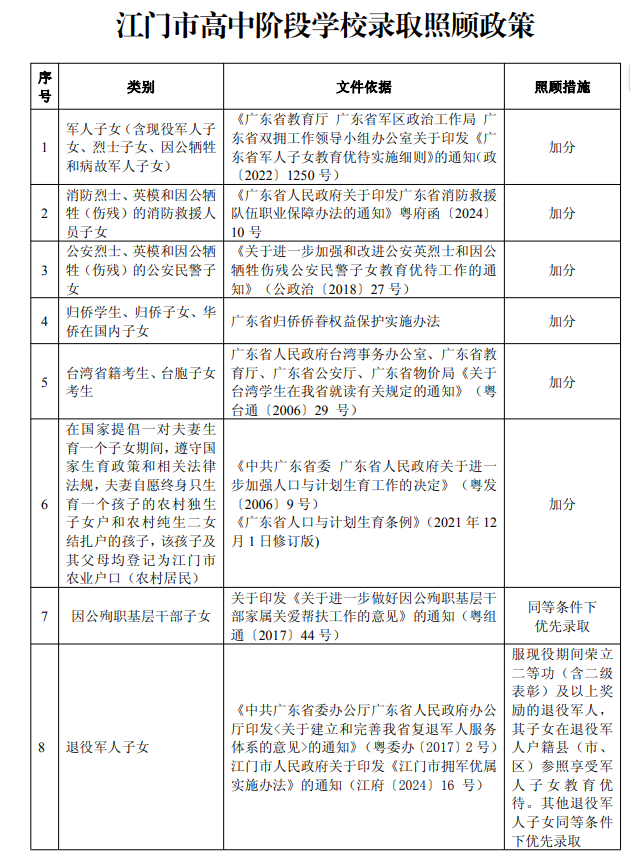 江门市高中阶段学校录取照顾政策