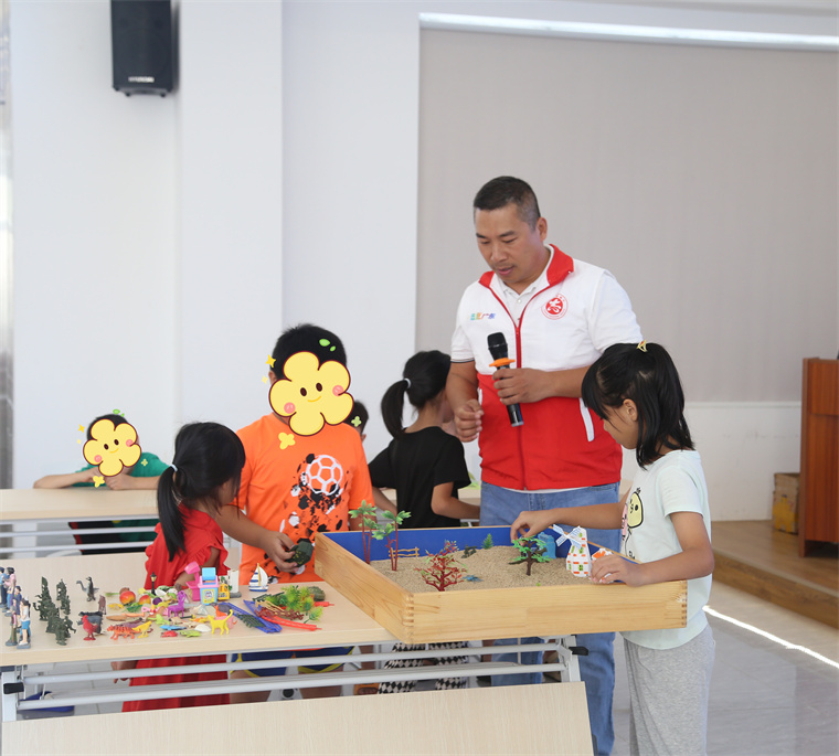 活动的第一环节是沙盘游戏环节。心理咨询师通过沙盘游戏,引导孩子们轮番挑选“房树人”(主题)的沙具,然后一边摆放一边介绍属于自己的故事,既激发了孩子们的表达欲,又能在表达的过程中引导孩子们要正向地、有效地表达事件、关系和情绪。