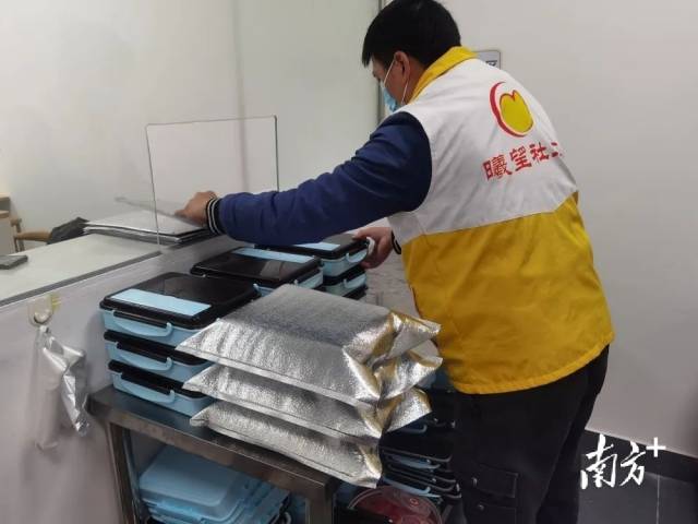 冬天,社工们在饭盒外加上一层铝箔保温袋,最大限度保持饭菜温度。