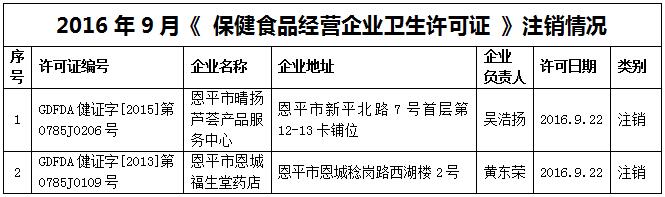 快猫 2016年9月《保健食品经营企业卫生许可证》、《食品经营许可证》(保健食品)许可公示