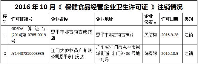 快猫 2016年10月《保健食品经营企业卫生许可证》、《食品经营许可证》(保健食品)注销情况许可公示