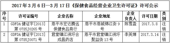 根据《中华人民共和国行政许可法》、《食品经营许可管理办法》的相关规定,我局现将2017年3月6日—2017年3月17日保健食品的行政许可(注销)有关情况予以公示。欢迎社会各界予以监督。