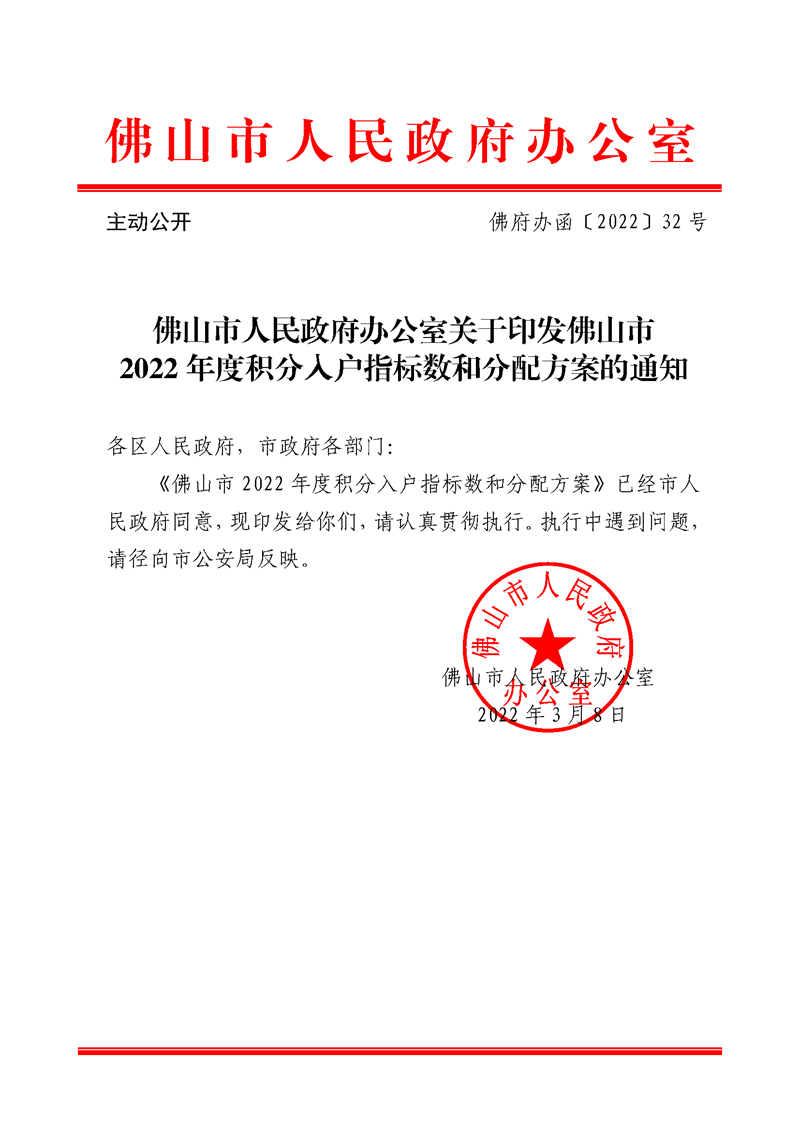 佛山市人民政府办公室关于印发佛山市2022年度积分入户指标数和分配方案的通知