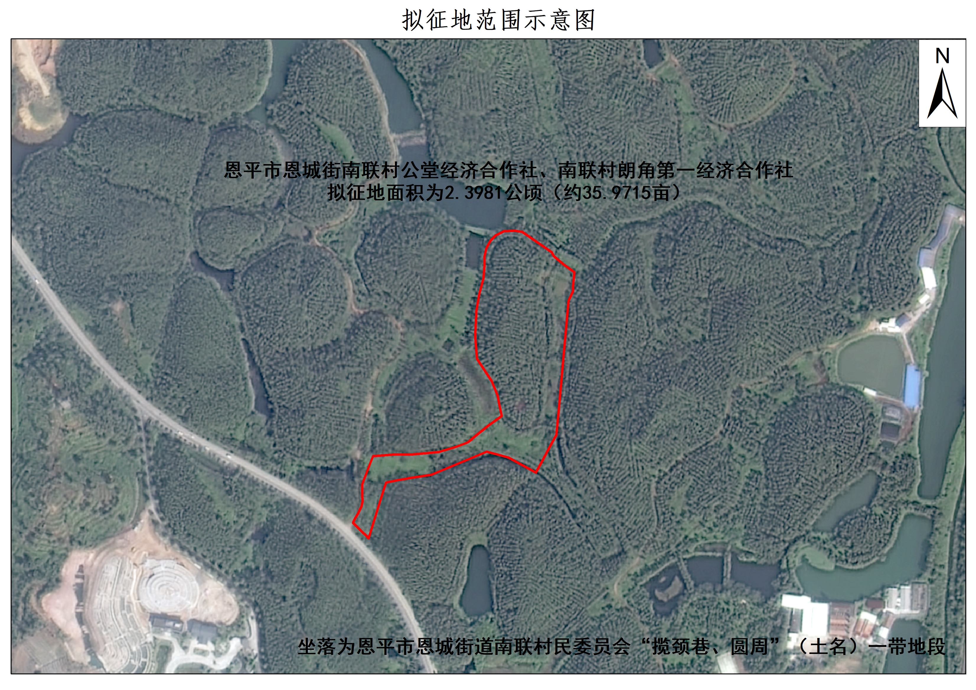 拟征收土地位于快猫 恩城街南联村公堂经济合作社、南联村朗角第一经济合作社,拟征收土地面积2.3981公顷(约35.9715亩)。用地红线详见附图。