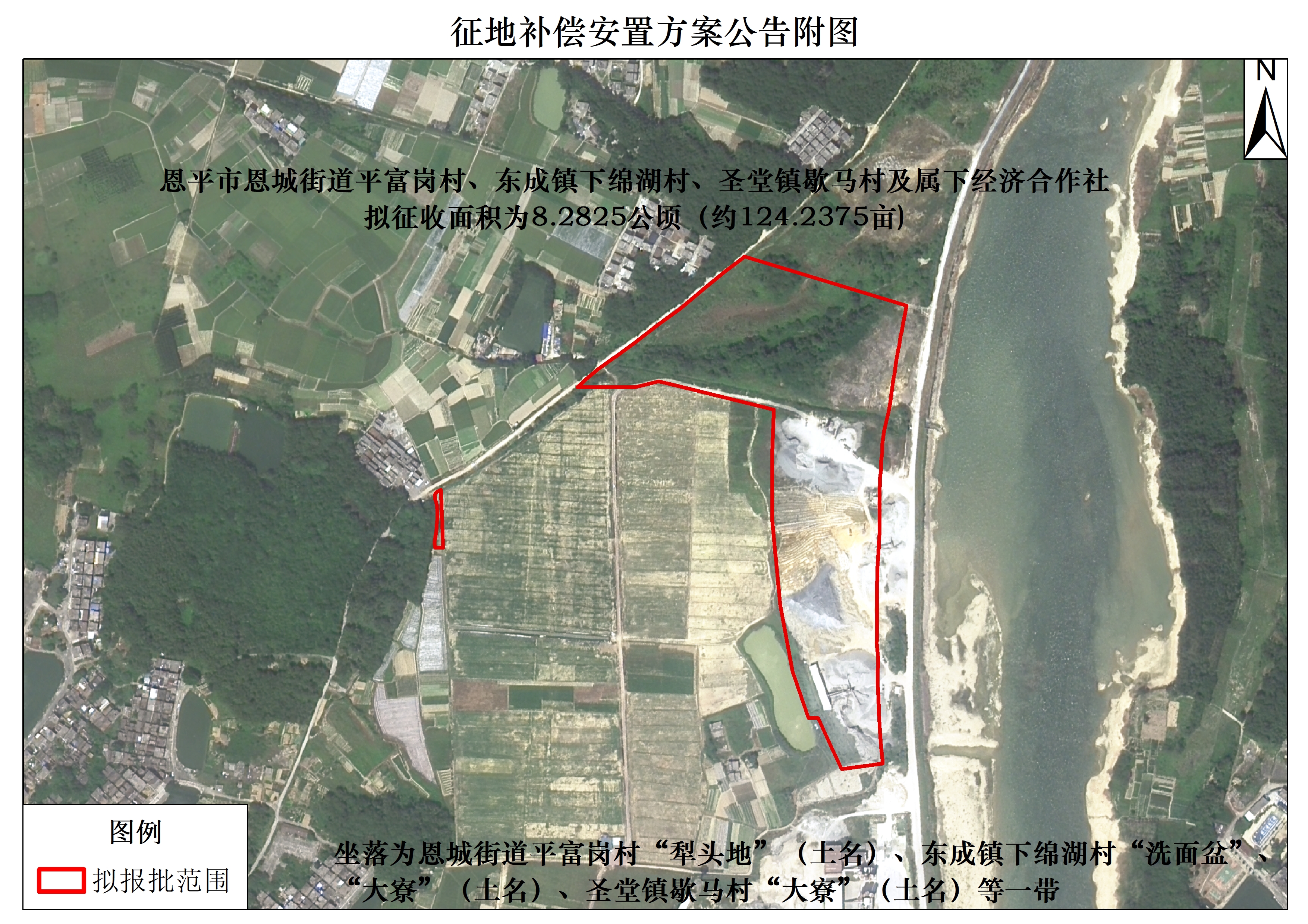 拟征收土地位于恩城街道平富岗村“犁头地”(土名)、东成镇下绵湖村“洗面盆”、“大寮”(土名)、圣堂镇歇马村“大寮”(土名)等一带地段范围内,具体位置详见附图。