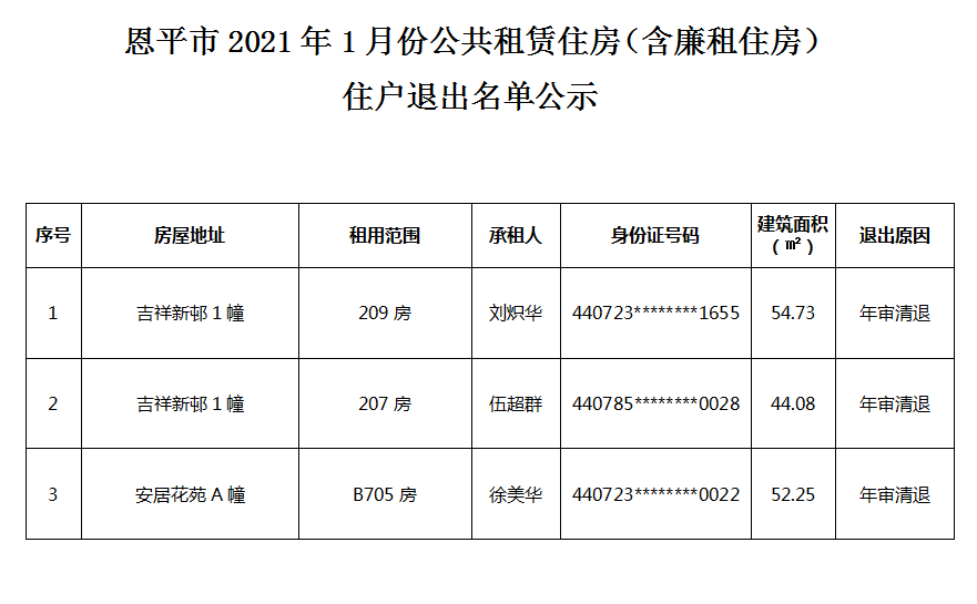 快猫 2021年1月份公共租赁住房(含廉租住房)住户退出名单公示