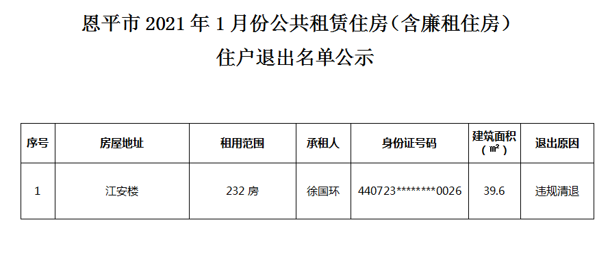 快猫 2021年1月份公共租赁住房(含廉租住房)住户退出名单公示