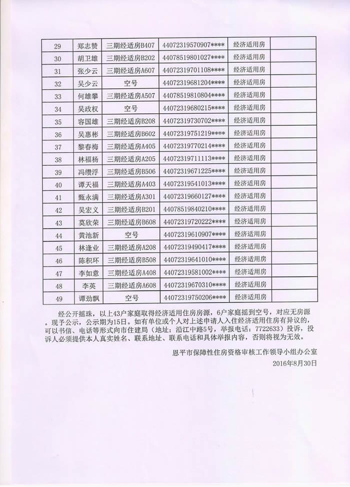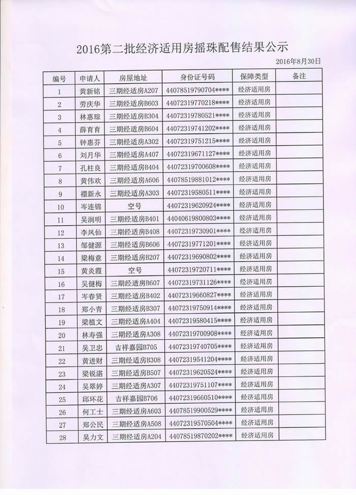2016第二批经济适用房摇珠配售结果公示