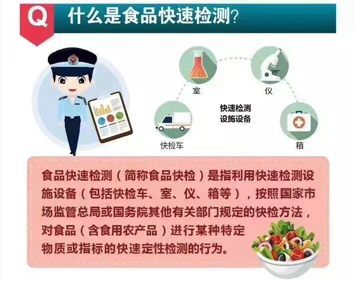 食用农产品快速检测是应用试剂盒对蔬菜、水产品、鲜肉、水果等是否存在农药、兽药残留超标进行快速甄别的方法。目前,检测范围主要包括蔬菜类有机磷和氨基甲酸酯类、除虫剂类、杀菌剂类等农药残留项目,水产品类的氯霉素、孔雀石绿、硝基呋喃代谢物等兽药残留,畜禽肉蛋类瘦肉精、金刚烷胺等项目。当农兽药残留含量超出食品安全国家标准时,试剂条则显示农兽药残留阳性反应,表示产品不合格。对不合格的食用农产品,检测人员会第一时间销毁下架。