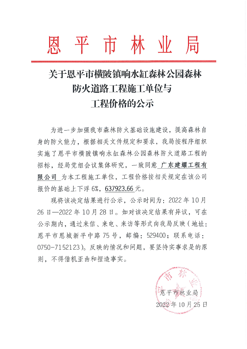 关于快猫 横陂镇响水缸森林公园森林防火道路工程施工单位与工程价格的公示