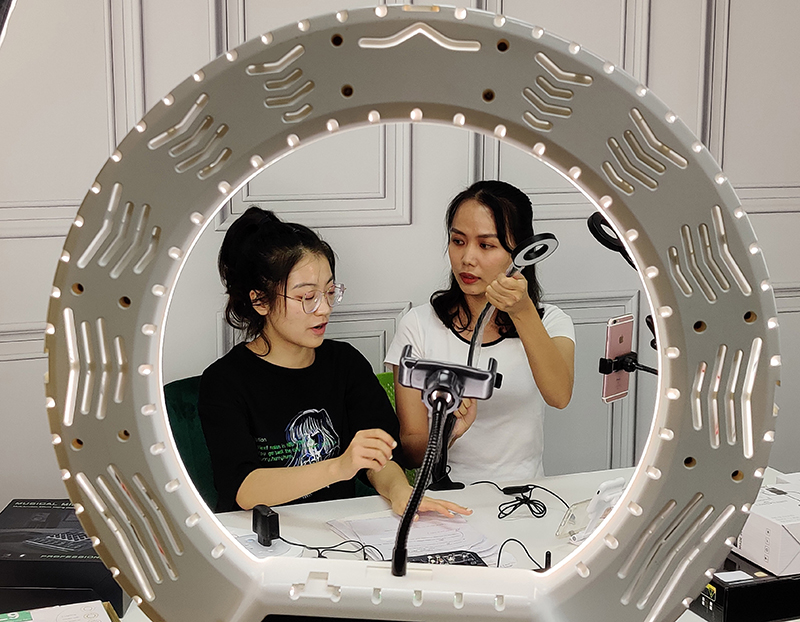 广西外国语学院越南留学生邓氏仙(右)在广西自贸试验区南宁片区一家跨境电商企业直播人才孵化基地内进行直播(2020年8月25日摄)。新华社记者 雷嘉兴 摄