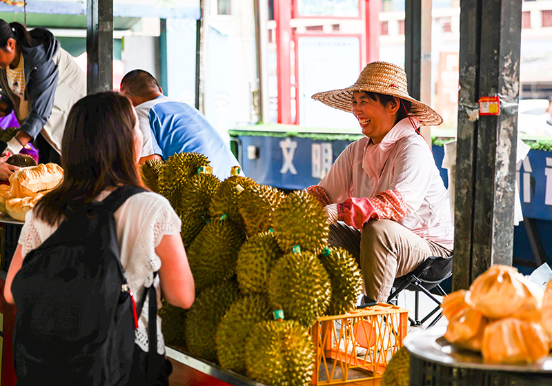 在广西东兴,越南果商在售卖榴莲(2023年5月18日摄)。新华社记者 胡星宇 摄