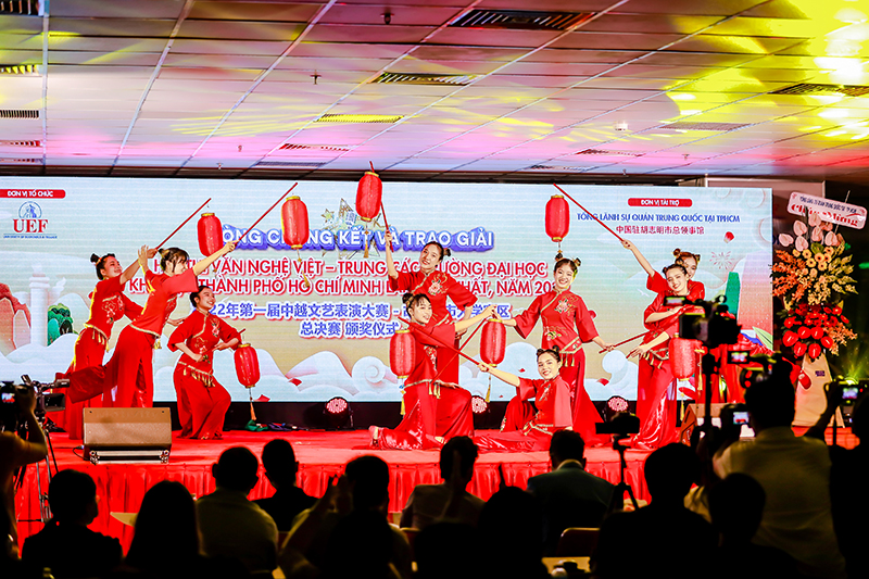 2022年4月15日,在越南胡志明市,胡志明市国家大学下属人文社会科学大学学生表演舞蹈节目《团圆之夜》。新华社发(中国驻胡志明市总领馆供图)